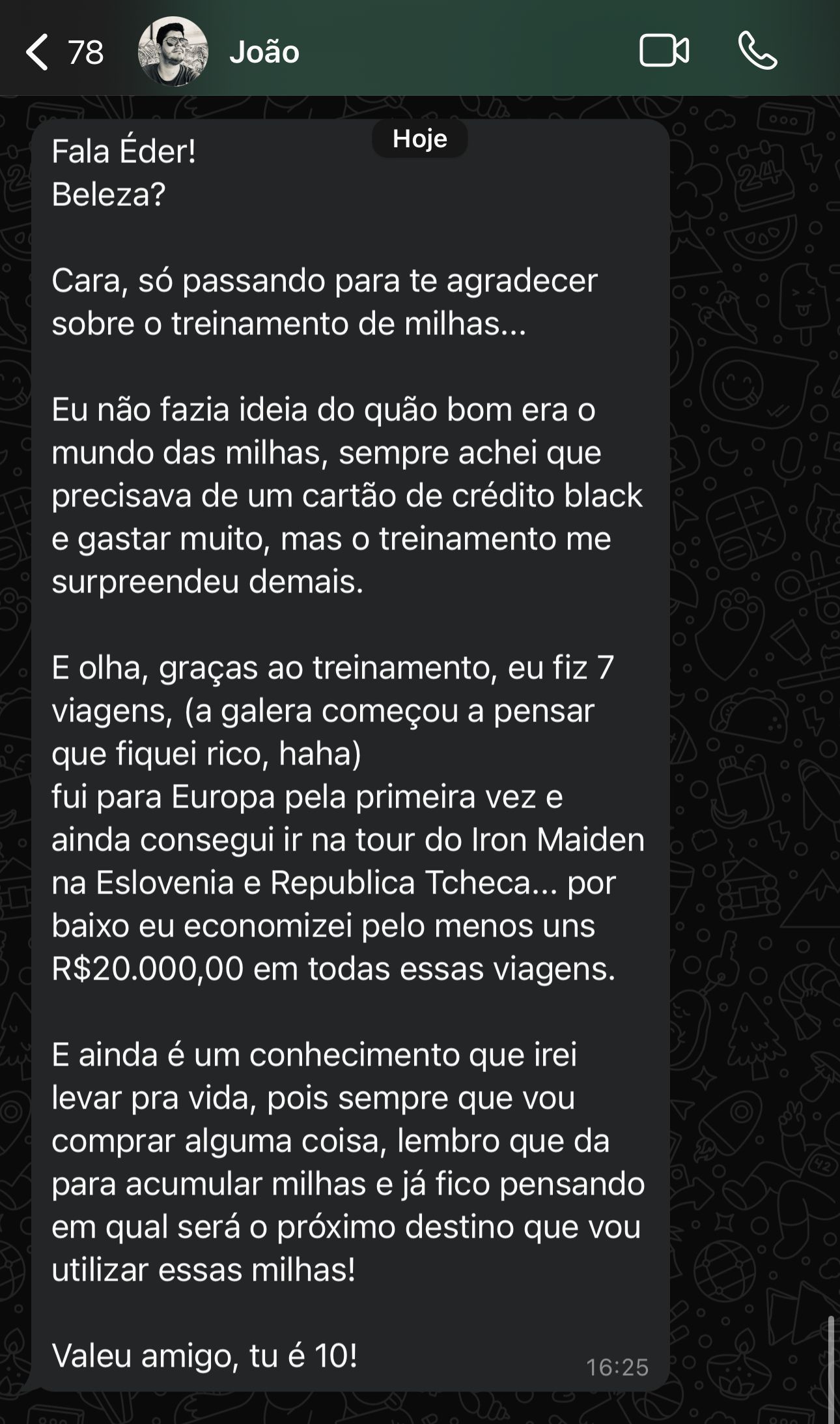 Porque quero ter milhares de alunos, e não apenas alguns poucos que têm mais dinheiro para começar. Meu objetivo é que o máximo de pessoas conheçam o mundo das milhas, e no futuro, poder ajudar você a chegar ainda mais longe.